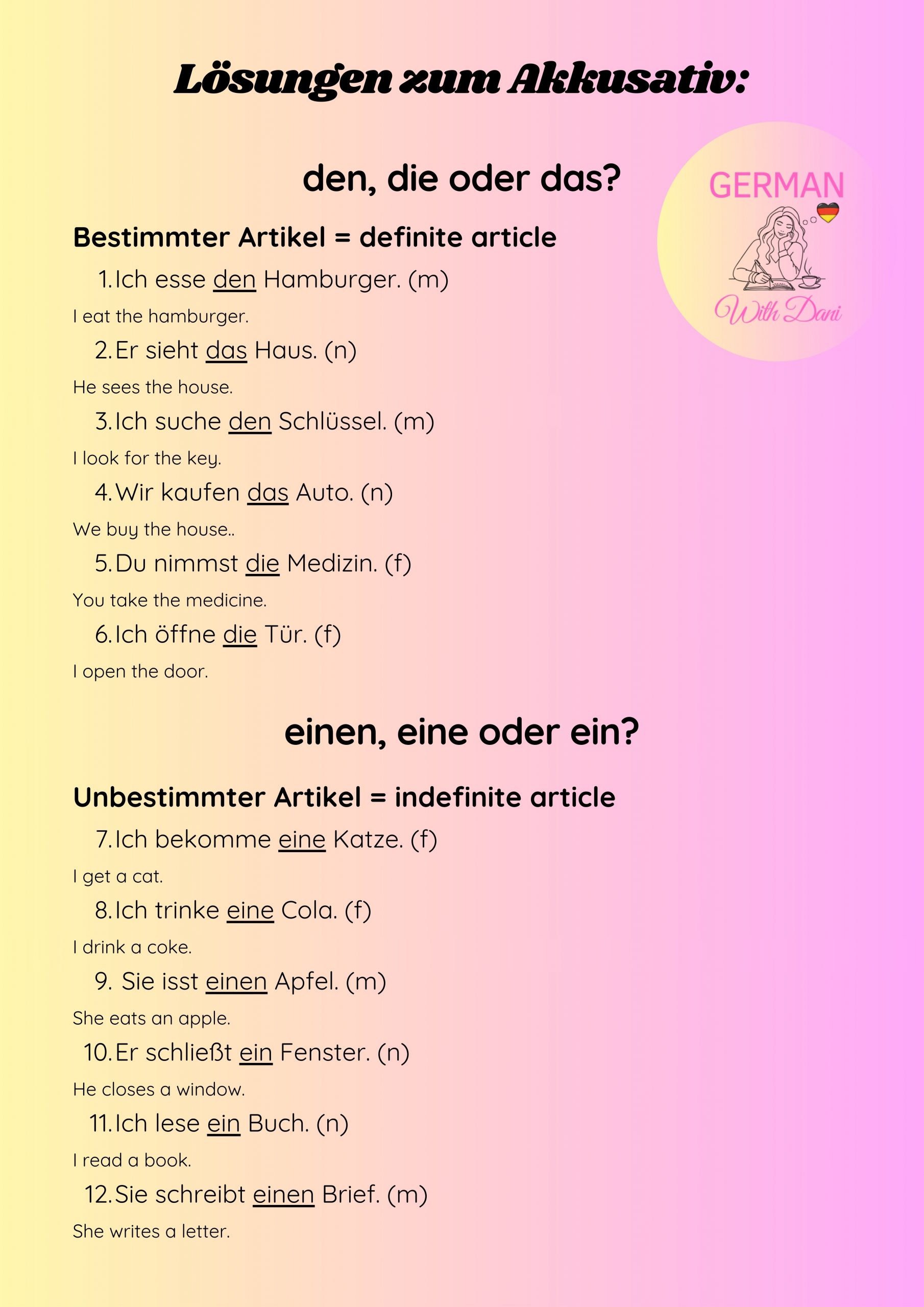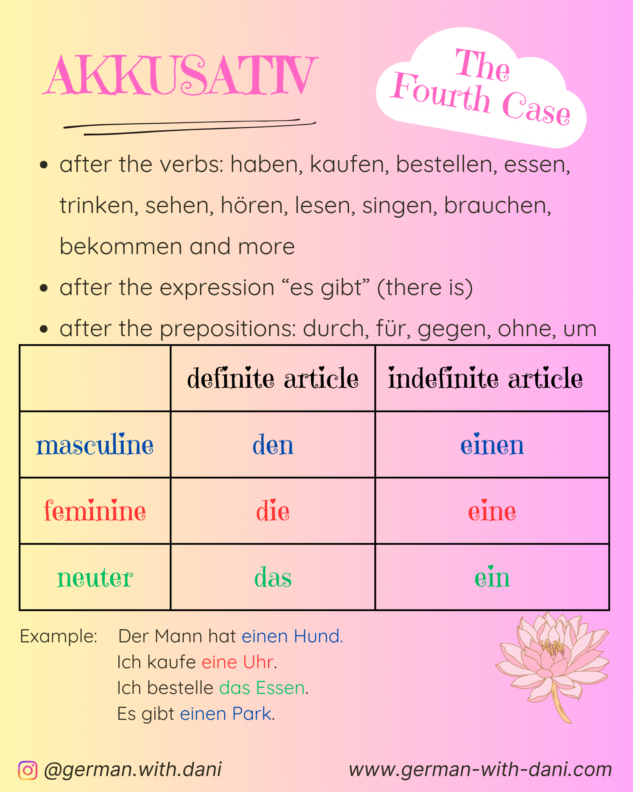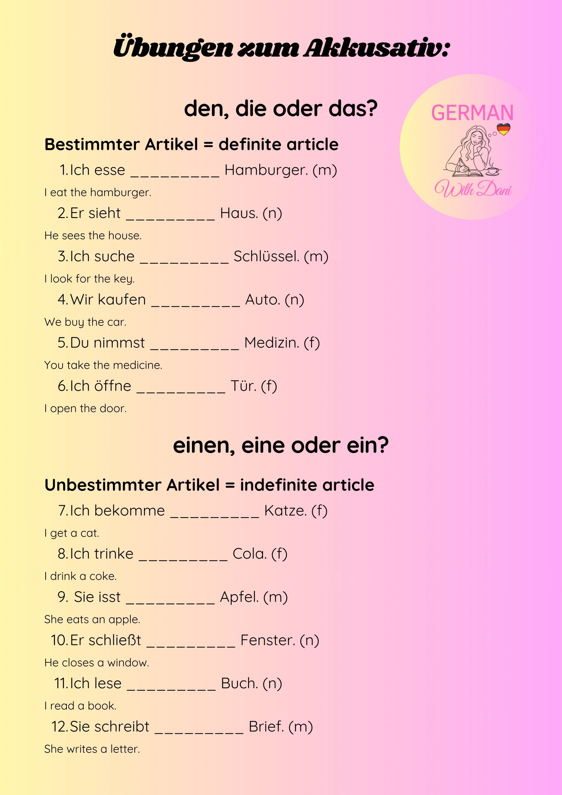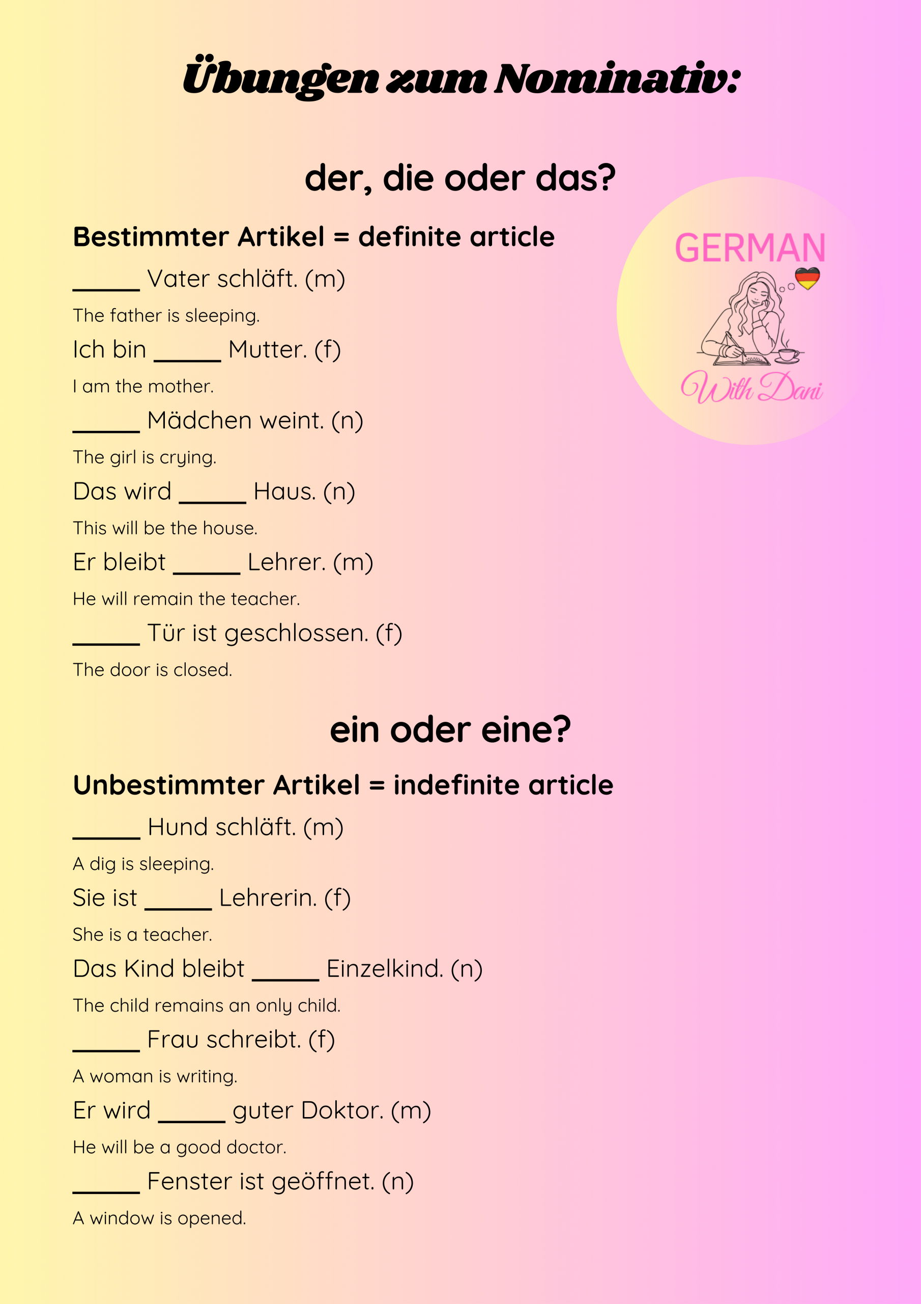 Master the four cases in German. Here you find the explanation, exercises and keys. Viel Erfolg! (= You’ve got this!)