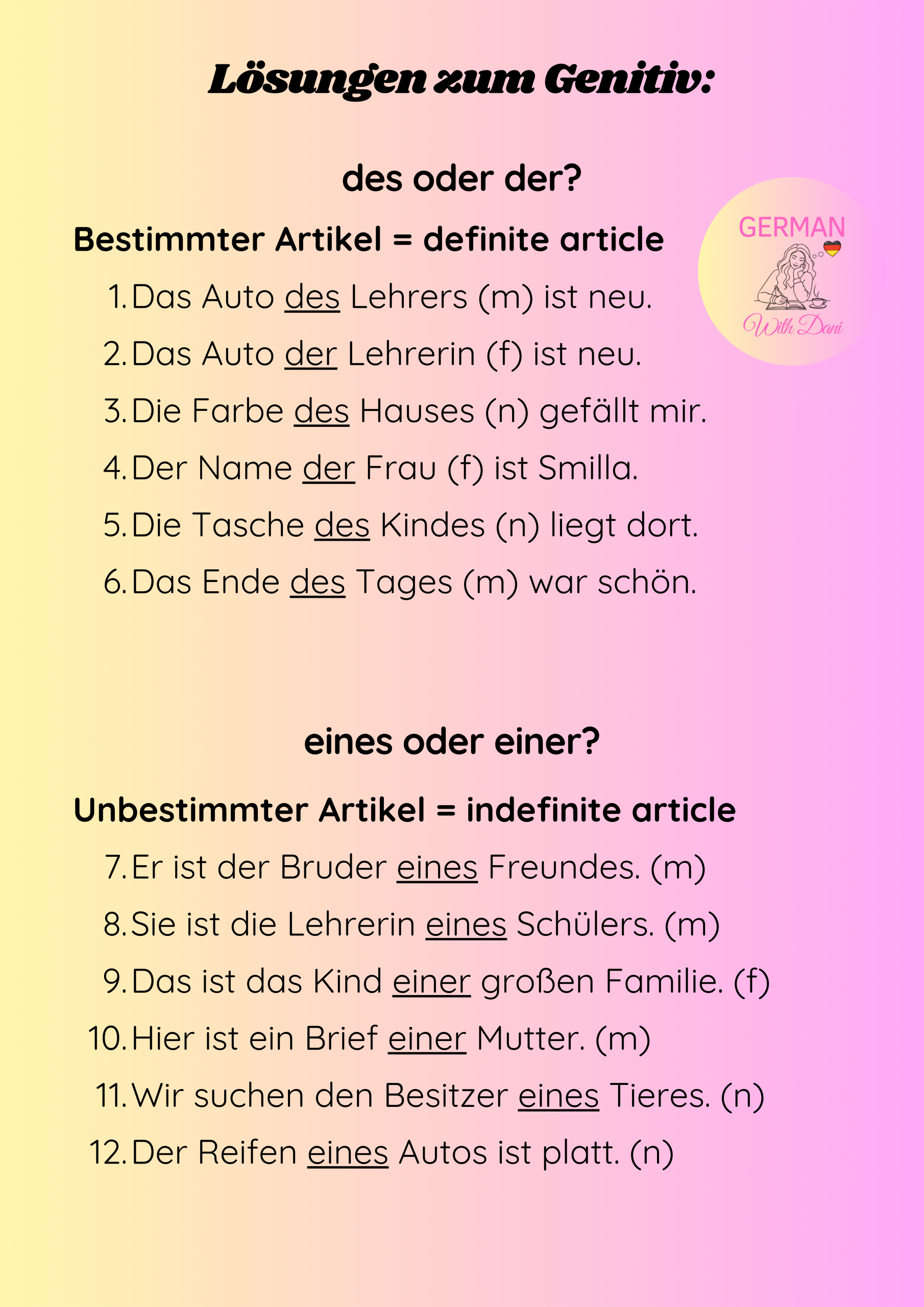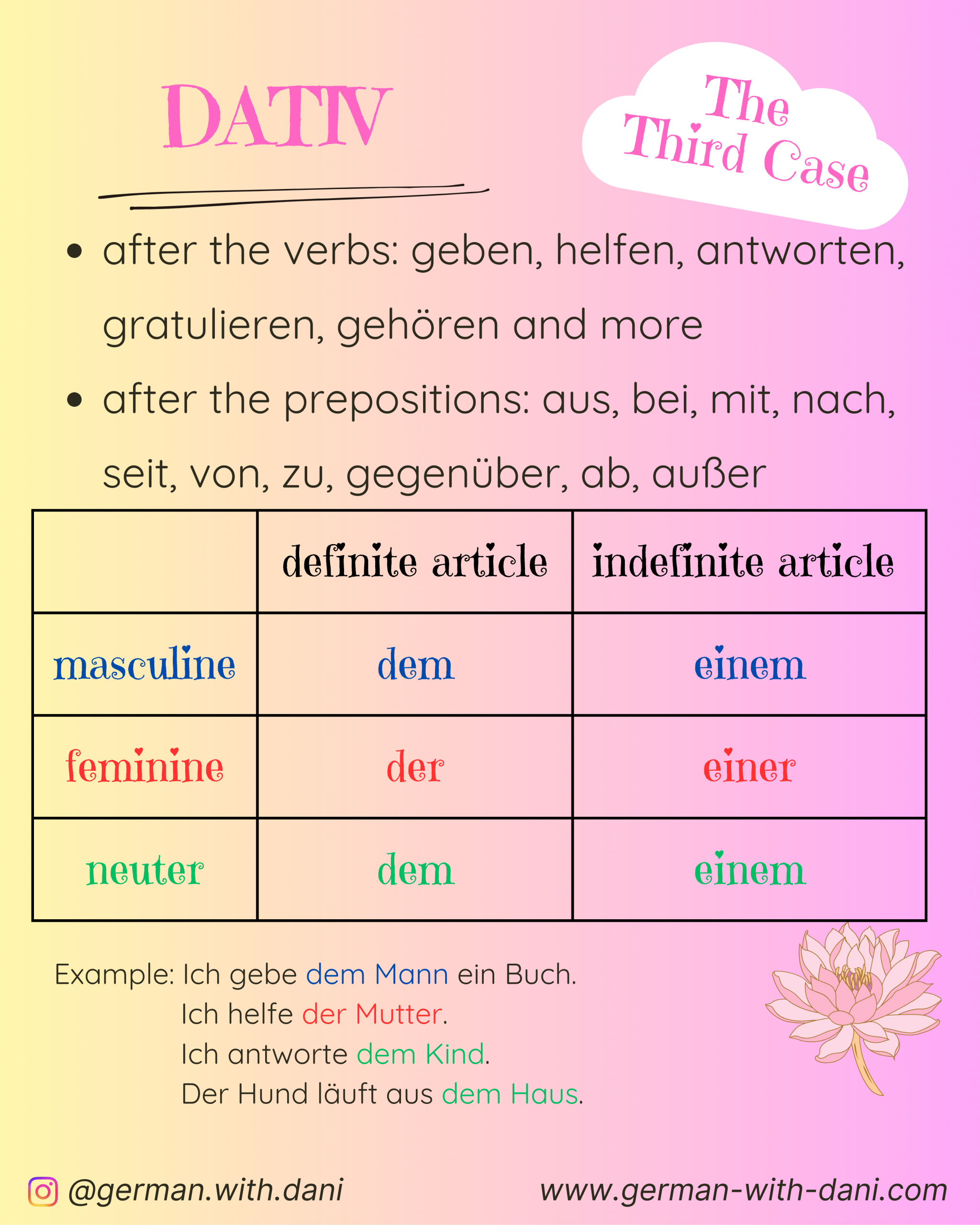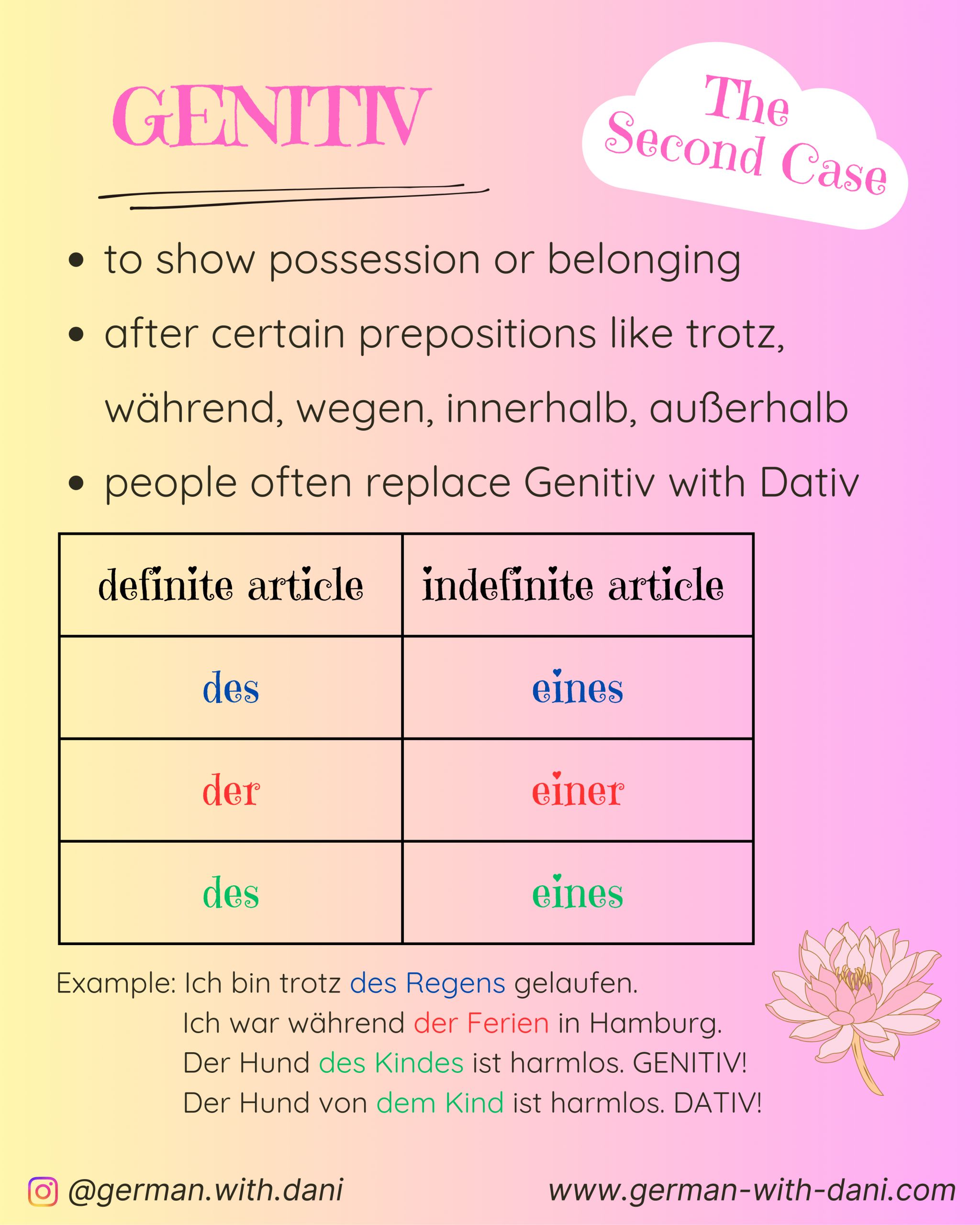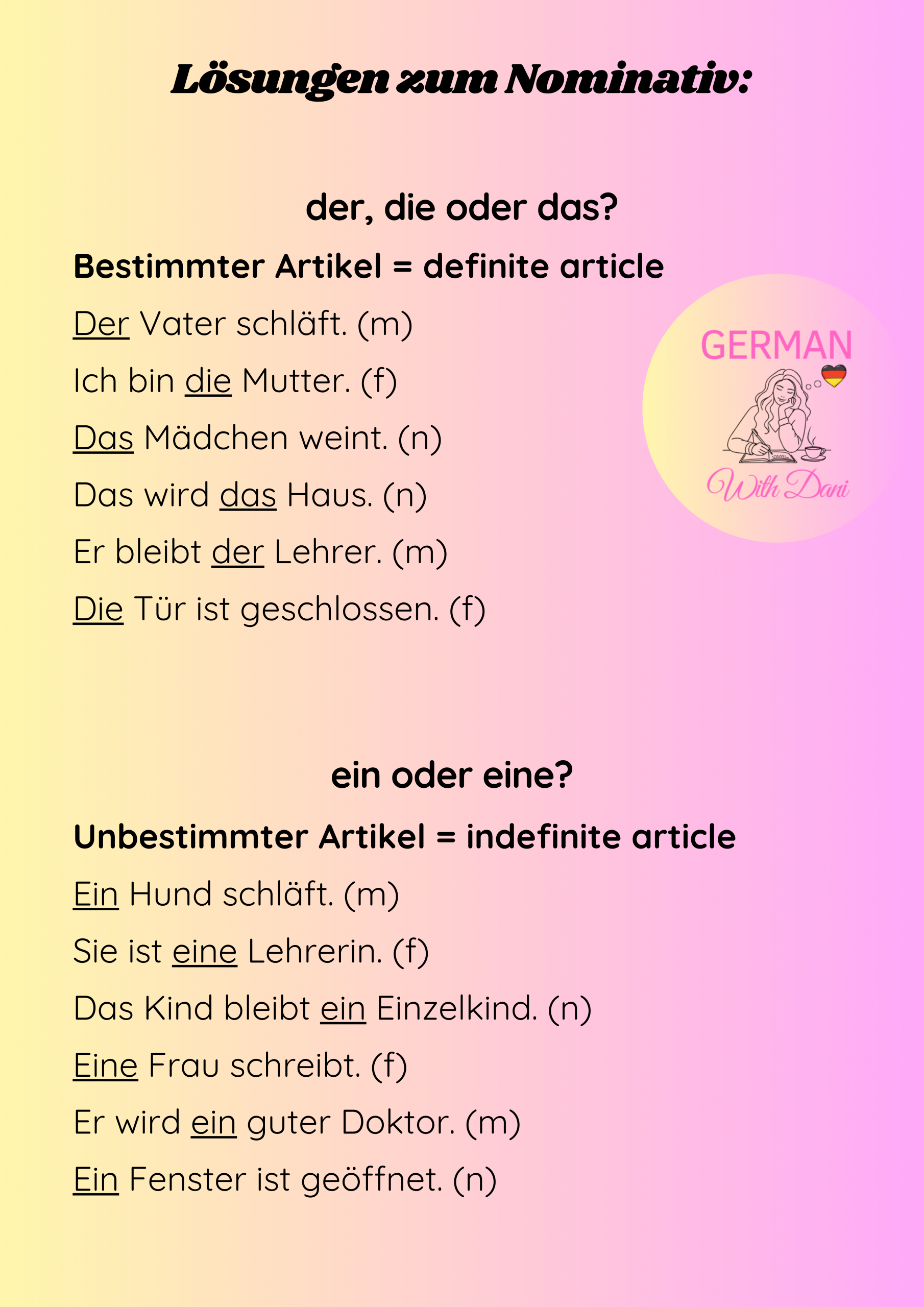 Master the four cases in German. Here you find the explanation, exercises and keys. Viel Erfolg! (= You’ve got this!)